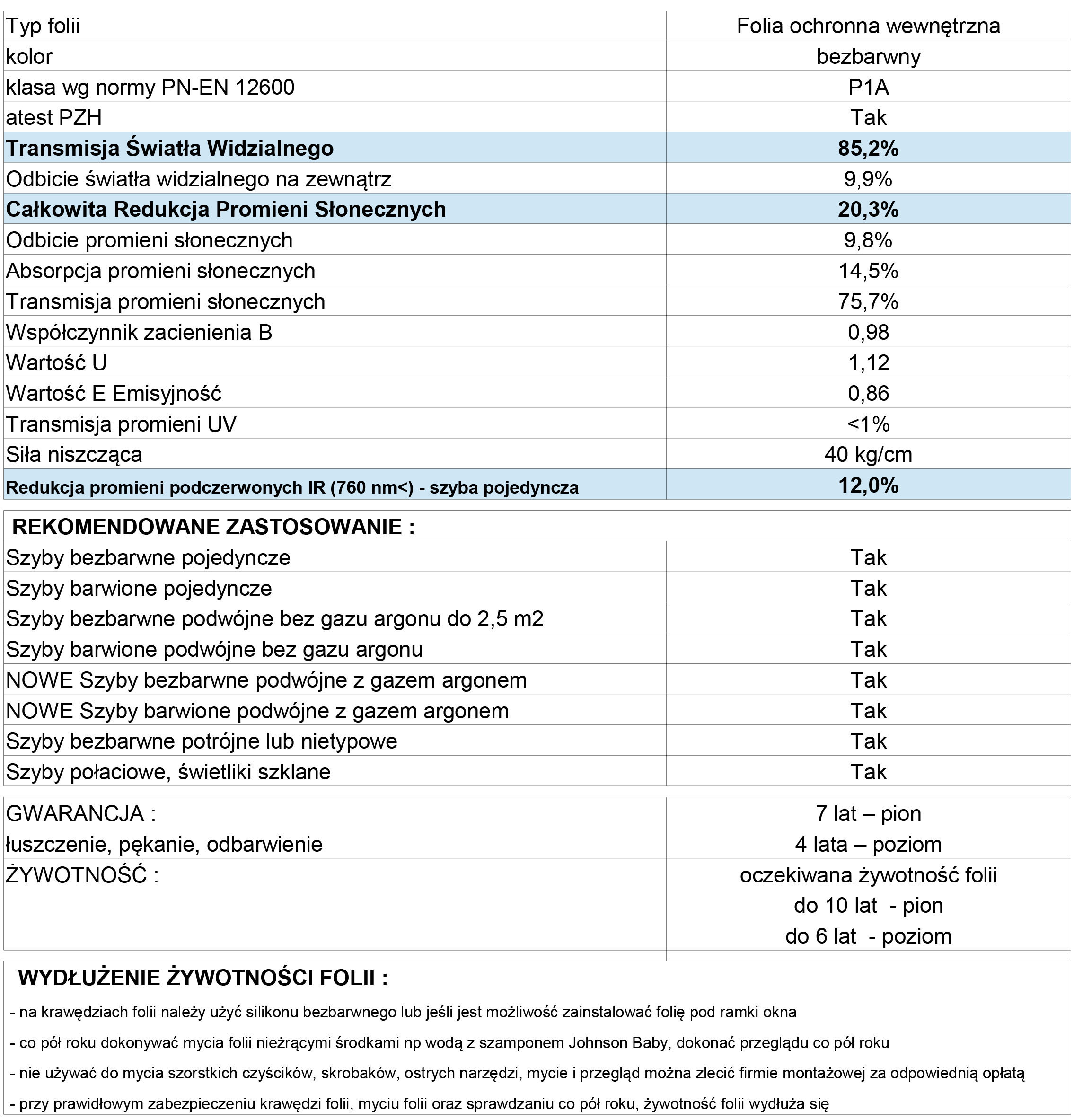 Folia spełnia normy PN-EN 356 oraz PN-EN 12600. Folia Klasy 01 zabezpieczająca osoby i linie technologiczne przed zbiciem szyby, a także przy innych czynnikach zewnętrznych jak niedogodne warunki atmosferyczne, upadek gałęzi czy uderzenie piłką. Stosowana jako zabezpieczenie przed włamaniem na szybach okiennych. Folia do aplikacji wewnętrznej. Efekt antywłamaniowy wzmocniony jest przy montażu folii pod uszczelki.